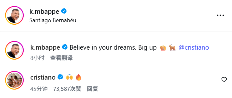 而在赛后,姆巴佩更新社媒,向C罗表达了敬意。姆巴佩发文写道:“相信你的梦想。向C罗致敬。”
