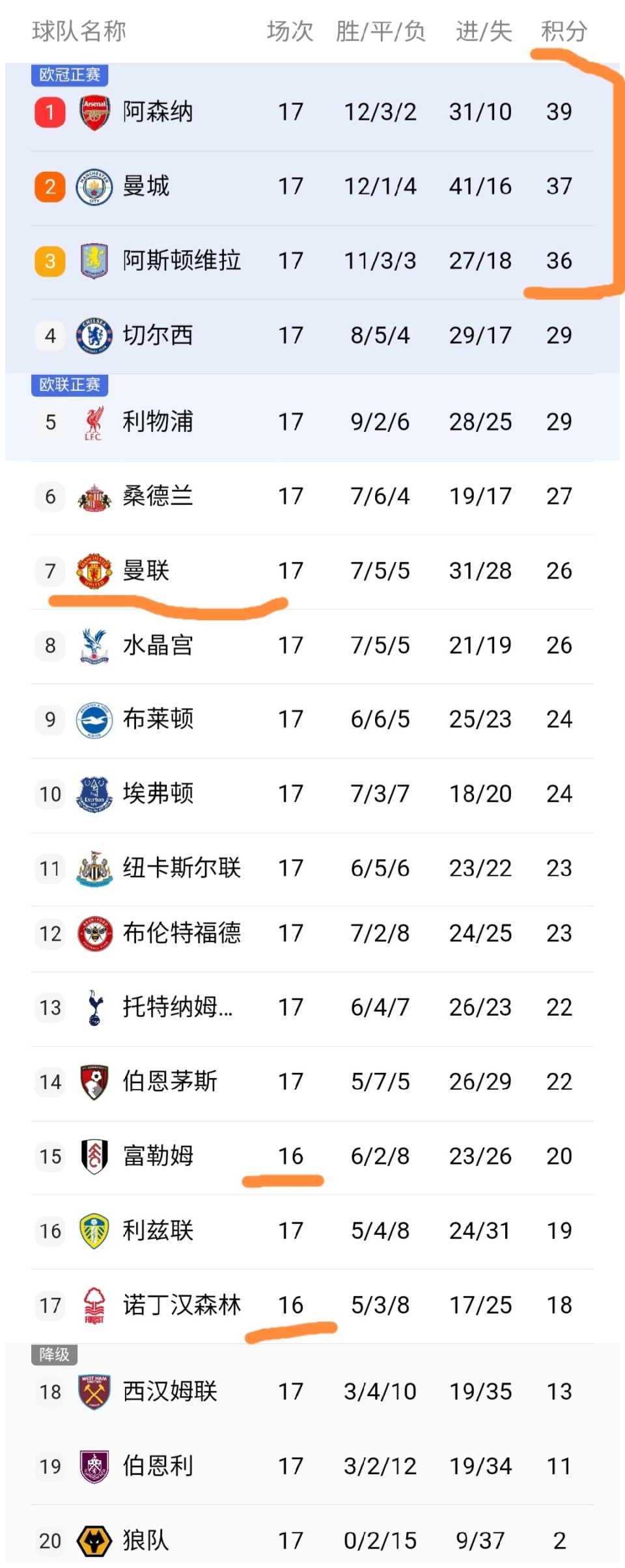 曼联做客PK维拉的比赛之后,英超第17轮目前仅剩富勒姆主场PK诺丁汉森林的比赛还没有踢,其他球队都已经踢完了英超第17轮的比赛。
