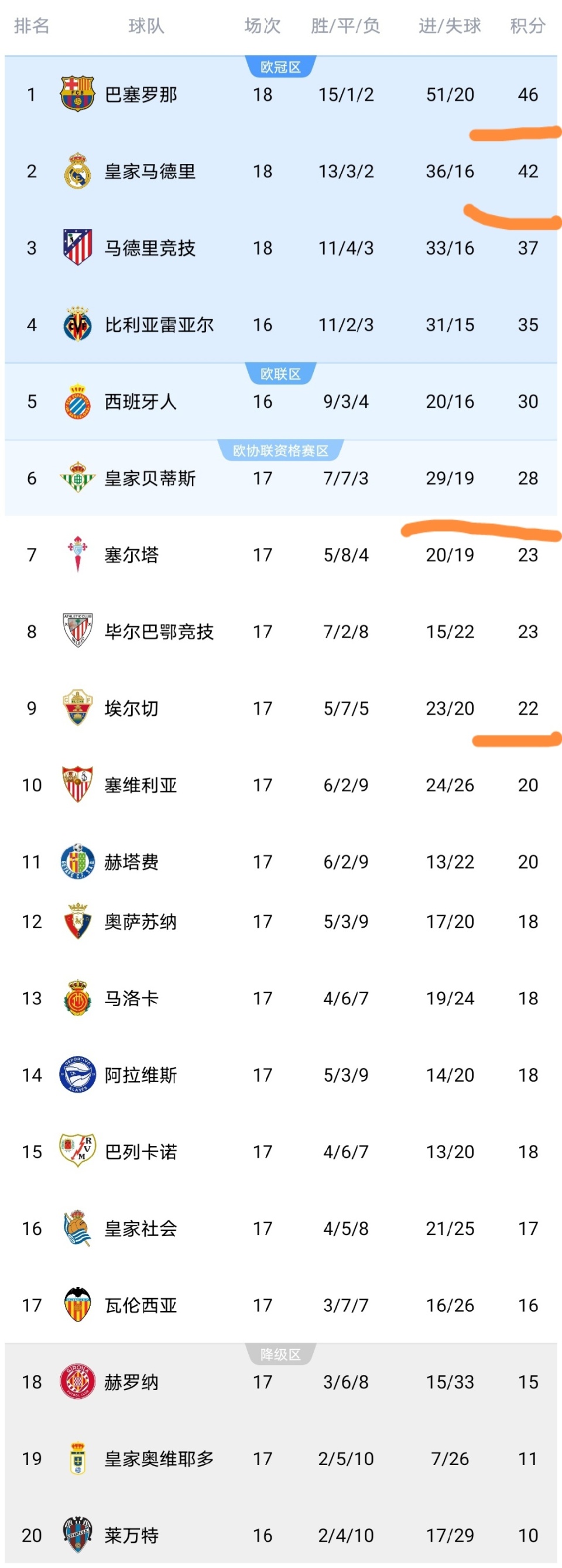 昨晚至今天凌晨,马竞,巴萨、贝蒂斯、埃尔切等队出战西甲第17轮的比赛,比赛过后,西甲积分榜得到更新。