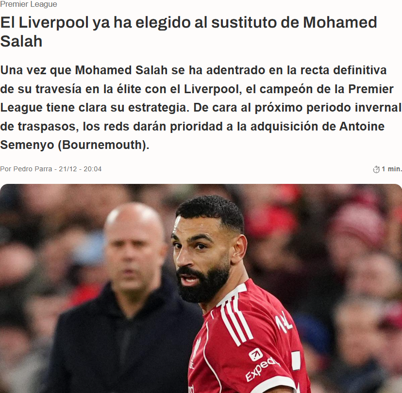 在塞梅尼奥的合同中有一条7500万欧元的解约金条款,最早可以在1月激活,因此在冬窗将展开一场对塞梅尼奥的争夺战,因为曼联、热刺和曼城也对他感兴趣,但塞梅尼奥本人倾向于加盟红军。他已经在英超征战3个多赛季,表现一直稳中有升。大家认为塞梅尼奥适合利物浦吗?他能完美替代萨拉赫吗?欢迎在评论区讨论。