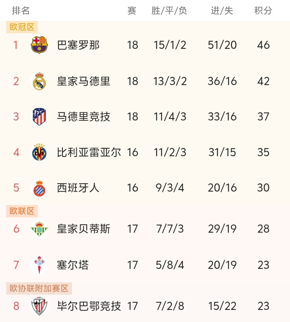 北京时间12月22日,西甲联赛第17轮战罢,领头羊巴塞罗那客场2-0击败了比利亚雷亚尔,联赛8连胜顺利的完成了2025年年度收官战,此前皇家马德里主场2-0击败了塞维利亚,这样一来,巴萨继续领先皇马4分,排名第一,皇马第二,马德里竞技本轮也赢球了,他们排名第三,西甲又开始了三强争霸的局面,不过身后的比利亚雷亚尔少赛了两场,他们落后的并不多!
