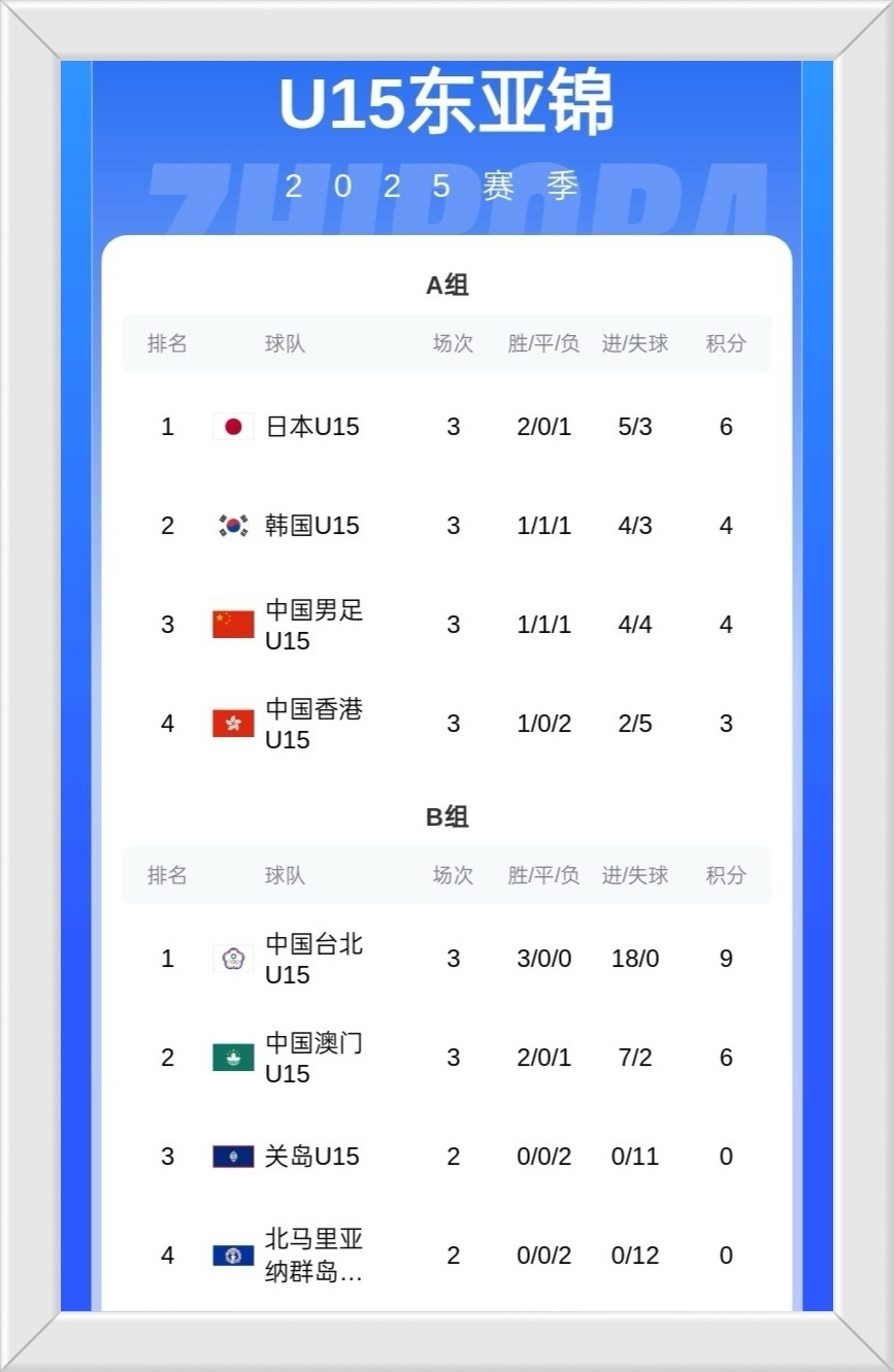 本次U15东亚杯具体排名如下。