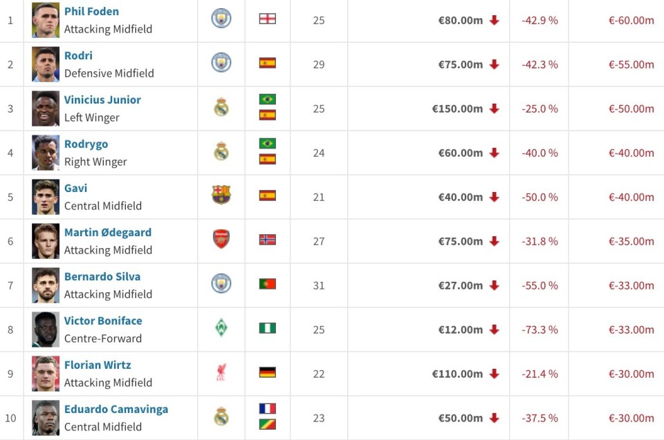 1. 福登(曼城) -6000万欧元(-42.9%) 8000万欧元