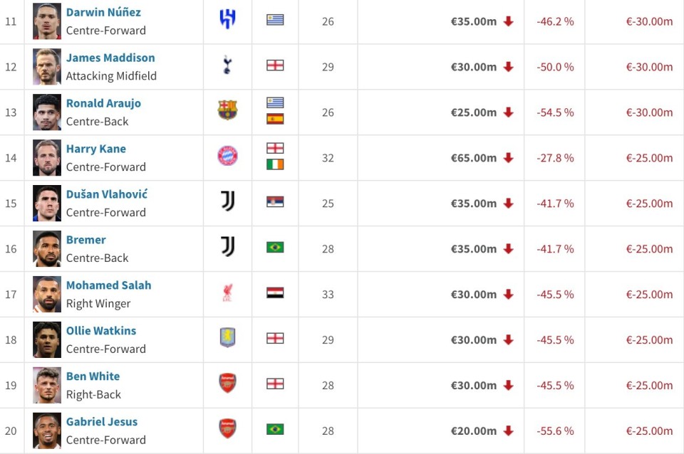 德转2025年身价跌幅榜:福登跌6000万最高,维尼修斯跌5000万