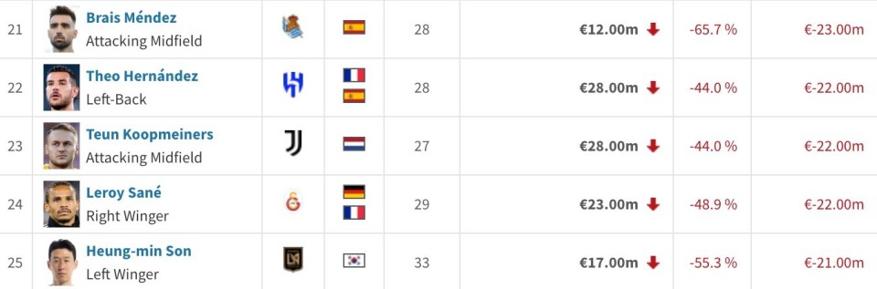 22. 特奥-埃尔南德斯(利雅得新月) -2200万欧元(-44%) 2800万欧元