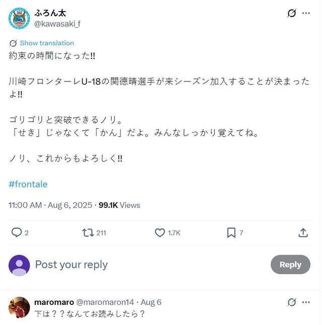 川崎前锋官方媒体曾在8月份就宣布,关德晴和另一名年轻小将一同进入下赛季一线队,他们将代表川崎前锋出战下赛季的J联赛,当时川崎前锋官方吉祥物账号曾发文表示,关德晴的关读音是源自中国姓氏的关,而不是日本本土起源的关,足以看出他和中国的渊源。