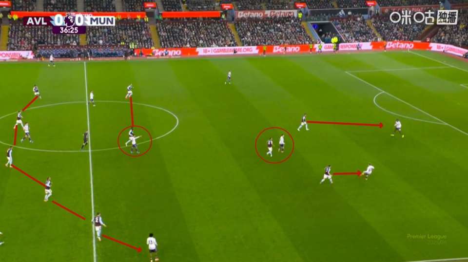 维拉在比赛中对于曼联的逼抢是非常到位,对于曼联球员基本上做到人盯人。沃特金斯和麦金跑动非常积极,极为有效地扰乱了曼联出球和后场组织。