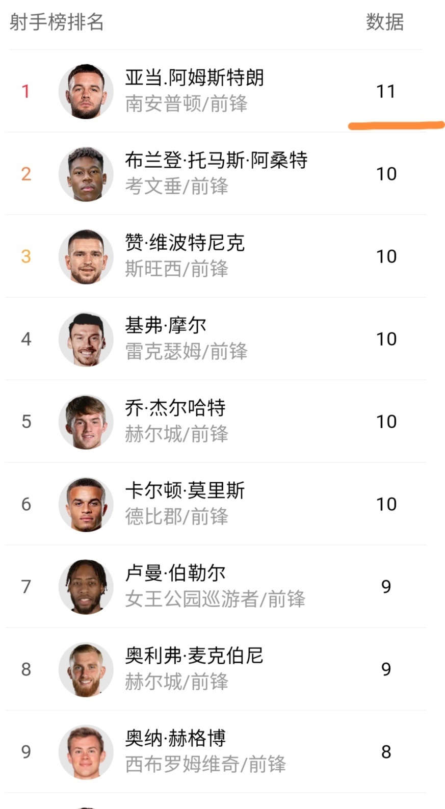 英冠最新射手榜情况:英冠射手榜有6人进球已经上双,第一的亚当11球,不过仅以1球优势领跑,可以看到英冠射手榜的争夺也是异常激烈。没有谁一枝独秀!