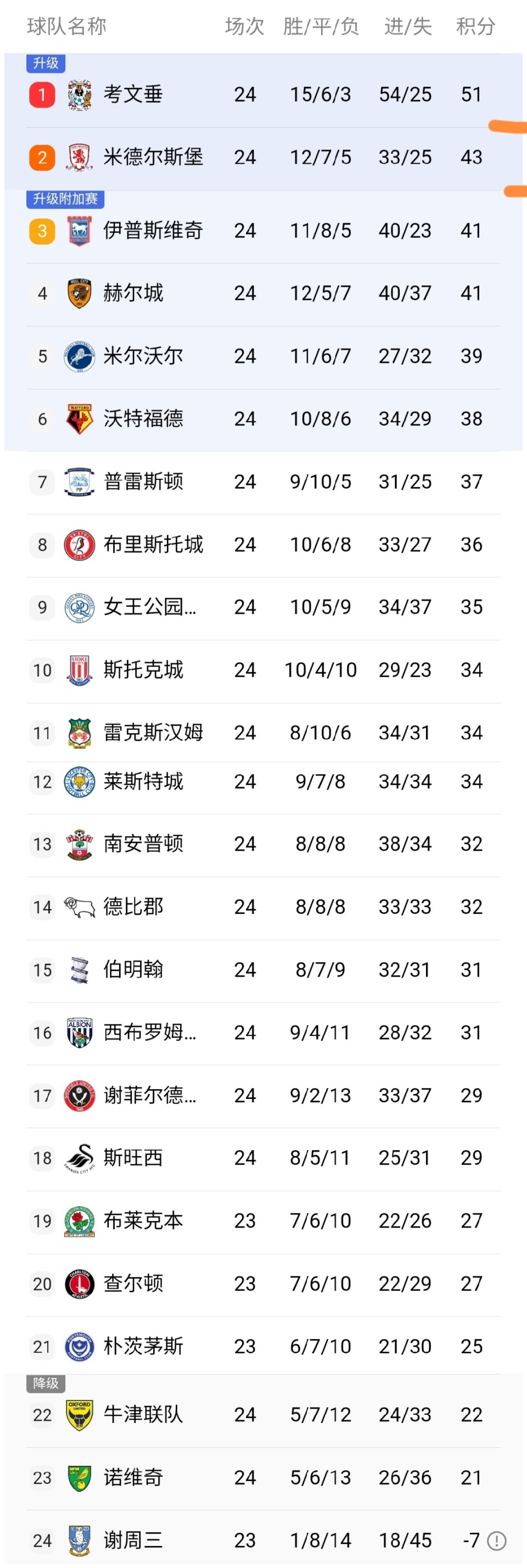 英冠最新积分榜情况:可以看到虽然考文垂队本轮输球了,但是他们依然积51分领跑,而且领先第2的米德尔斯堡队8分,同时领先第3的伊普斯维奇队10分,领先优势还是很大的。除了考文垂一枝独秀之外,有至少六支球队对于第二的位置虎视眈眈,可以看到英冠直接升级名额的争夺很是激烈。