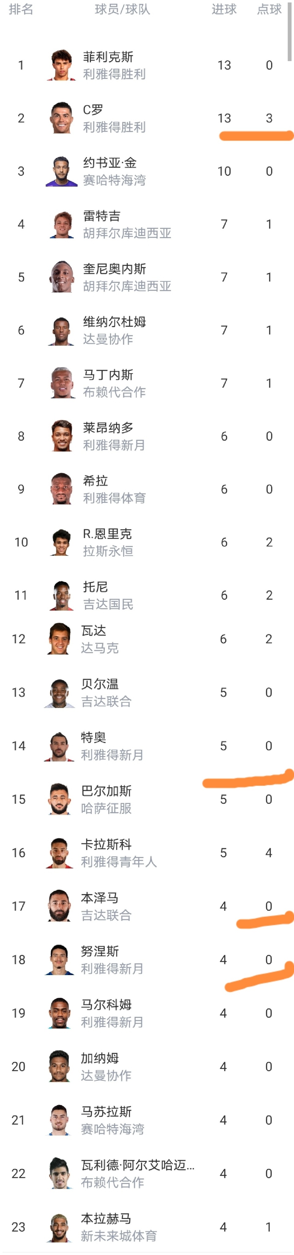 沙特联最新射手榜:射手榜前23可以看到有很多熟悉的球星上榜,C罗霸占第二,特奥、本泽马、维纳尔杜姆、努涅斯等球星榜上有名。