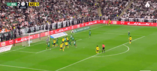 第44分钟,布罗佐维奇角球传中,阿米里高高跃起头槌建功,同样完成梅开二度好戏,利雅得胜利让二追二,比分变成2-2!