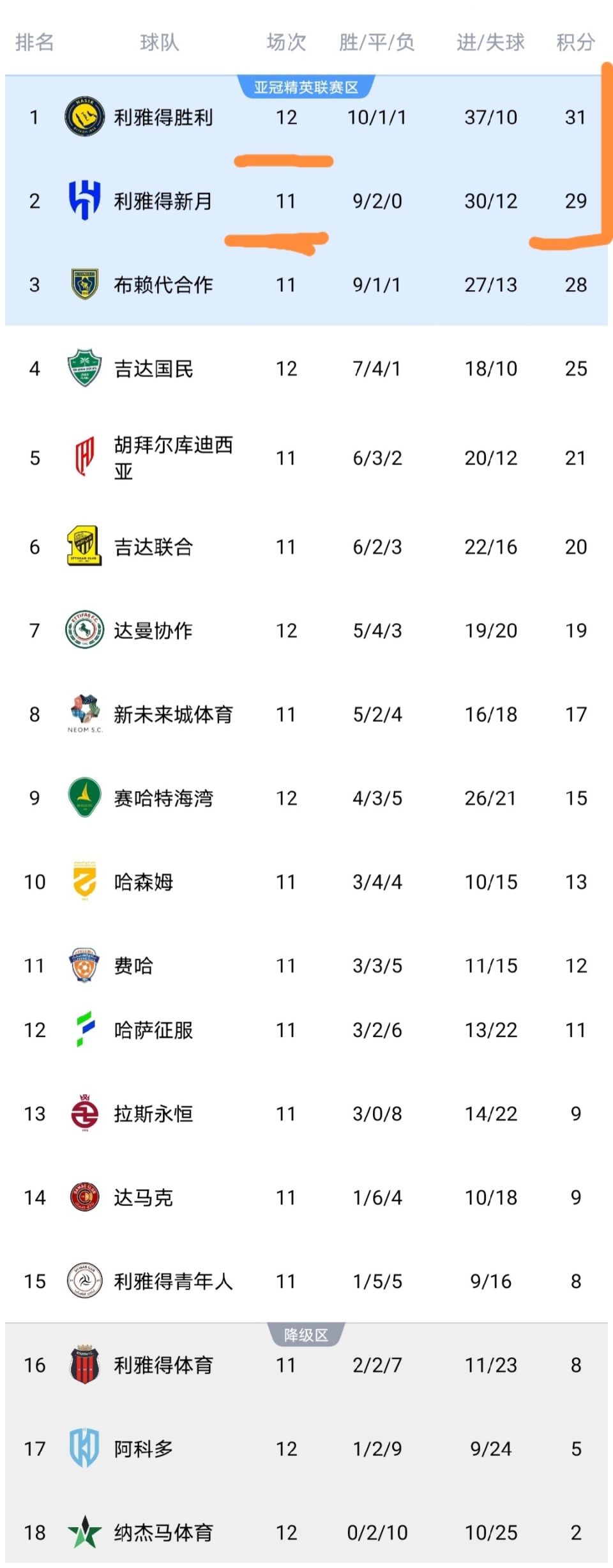 沙特联最新积分榜: