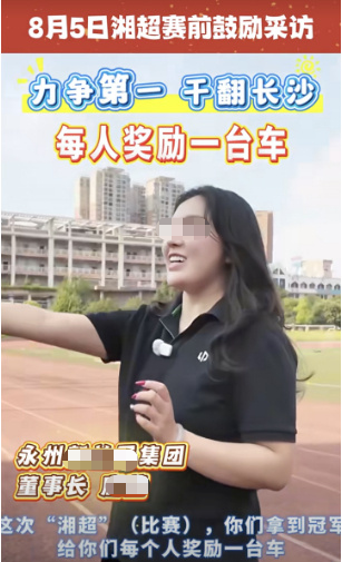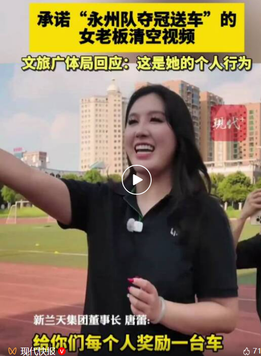 此前据现代快报报道:2025年12月27日,永州队逆袭夺得“湘超”冠军,记者注意到,此前承诺“永州队夺冠就给每位队员奖励一台车”的永州某集团董事长唐某,在2025年12月30日清空了个人社交账号的所有视频,被质疑“美女老板‘跑路’”。2025年12月31日,永州市文化旅游广电体育局回应记者称:“这是她的个人行为,官方不(能)存在强迫的行为。”