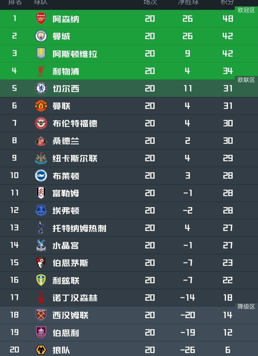北京时间1月5日,英超结束了第20轮的角逐。令人大跌眼镜的是,传统豪门集体拉胯。除了领头羊阿森纳之外,曼城、切尔西、曼联、热刺和利物浦,这“BIG6”中的其他5队,继上轮之后再次集体打平。