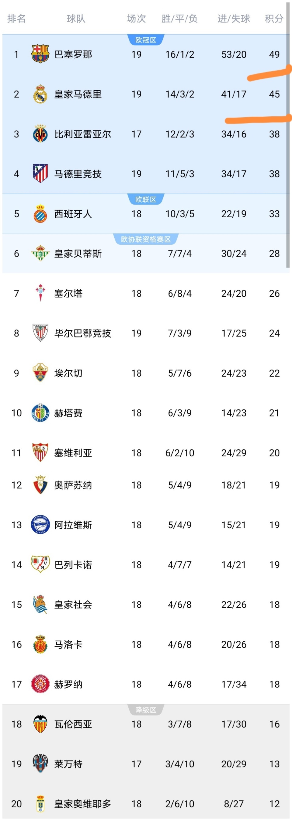 可以看到皇马击败皇家贝蒂斯之后积分达到了45分,跟领头羊巴萨仅有4分差距,皇马继续咬住巴萨,没有让巴萨把分差进一步拉大。而马竞本轮被皇家社会逼平之后,继续排名第4,无缘升至第3,很是可惜。莱万特赢球之后摆脱了垫底的位置!