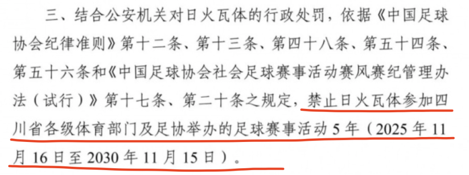 日火瓦体很快被控制,并被公安人员带走。12月30日,四川足协公布了对日火瓦体的处罚结果:“禁止日火瓦体参加四川省各级体育部门及足协举办的足球赛事活动5年(2025年11月15日-2030年11月15日)。”
