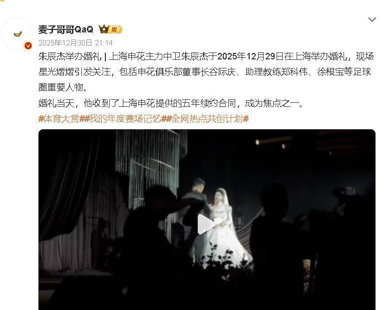 2025年12月29日,上海。 对朱辰杰来说,这是人生的大日子。 婚礼现场,堪称一场小型的中国足球顶级聚会。 上海申花的董事长带着一份五年的续约合同来了,国家队和俱乐部队友坐满了大厅。 最引人注目的,是坐在主桌、一身西装的徐根宝。 老爷子精神不错,还被新人请上台讲了话。