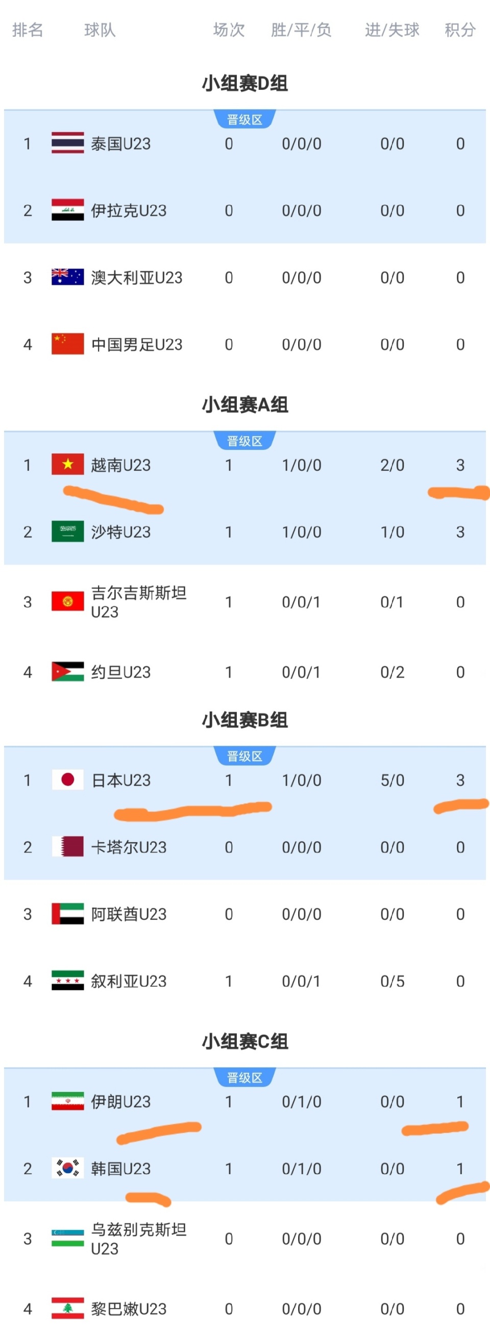可以看到A组领跑,而B组暂时领跑的是日本,C组的伊朗和韩国暂并列第一。