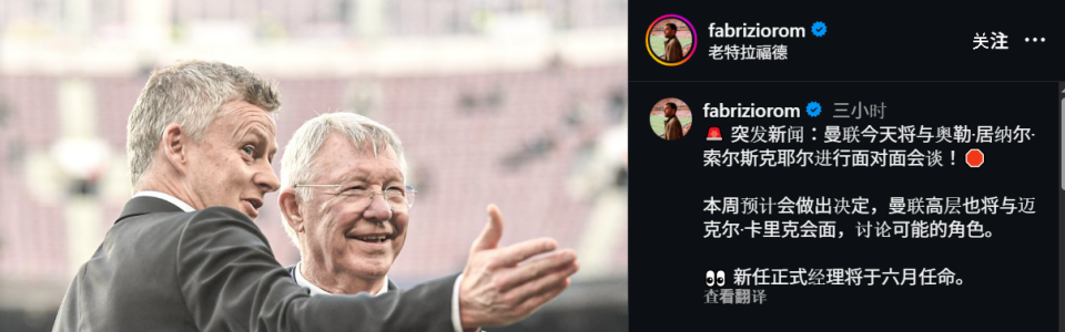 并且转会名记罗马诺也在社媒上确认:“索尔斯克亚与曼联围绕看守主教练一职的沟通正朝着积极方向推进。索尔斯克亚本人明确表达了执教意愿,他也是目前极具分量、被认真考虑的候选人之一,相关谈判正在持续展开。在合同年限问题上,双方并未遇到障碍,索尔斯克亚已经做好随时接受任命的准备。”