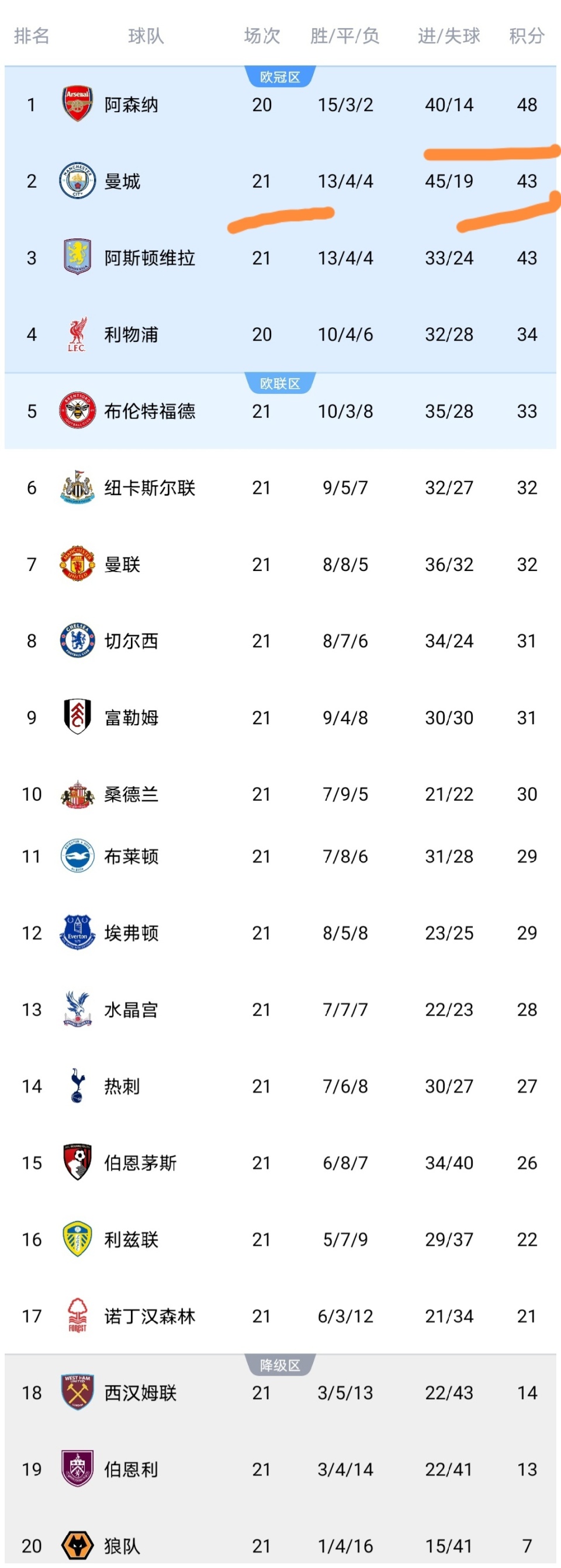 可以看到曼城遭阻击之后,积43分已经多赛一场落后阿森纳5分,阿森纳本轮赢球就能拉开8分距离,阿森纳真是渔翁得利啊。维拉本轮也遭阻击了,阿森纳的两个争冠劲敌同时遭阻击,这显然是天助阿森纳啊。布伦特福德击败桑德兰之后,已经积33分来到了第5的位置,逼近了第4,利物浦压力巨大,纽卡击败利兹联之后,来到了第6,也是对于第4虎视眈眈。而曼联受挫后依然第7,太令人失望了。