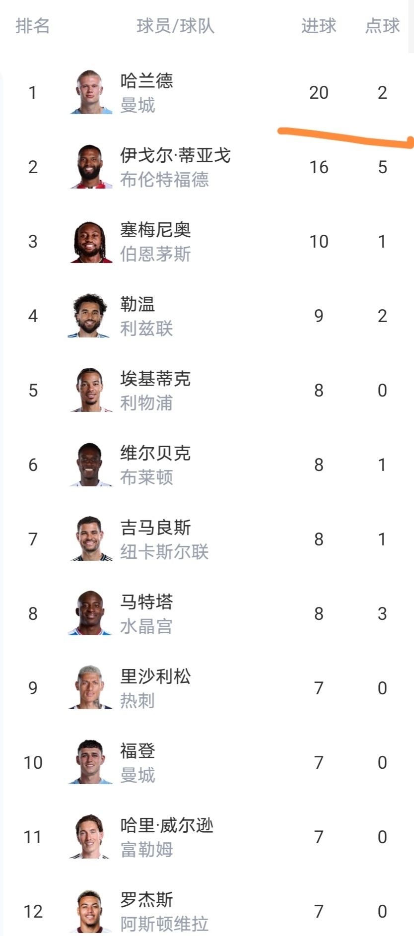 射手榜:哈兰德将进球数提升,领先第2的蒂亚戈4球,蒂亚戈也是挺猛的,哈兰德金靴不一定稳啊。要加油!