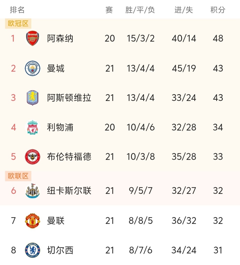 北京时间1月8日,英超联赛第21轮结束了多场比赛,曼联客场2-2战平了伯恩利,目前他们8胜8平5负,排名第7,曼城主场1-1战平了布莱顿,目前曼城13胜4平4负,排名第2,不过由于曼城近期平局过多,他们距离榜首的差距越来越大了,阿森纳本轮还没有出场,已经领先了曼城5分,本轮阿森纳将会对阵利物浦,这是一场值得一看的强强对话!