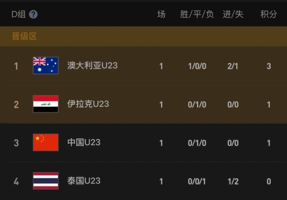首轮过后,澳大利亚积3分暂列小组第一,中国队和伊拉克队同积1分并列第二,泰国队0分垫底。对于志在突破历史(此前5届赛事均未能小组出线)的中国U23男足而言,从伊拉克身上拿到1分是可以接受的结果。