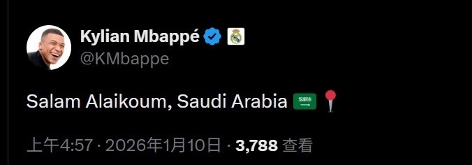 而姆巴佩也不负期待,他通过社媒发文,用阿拉伯语问好,同时还附上了沙特国旗和定位符号,确认了自己已经抵达沙特吉达,与皇马全队会合。