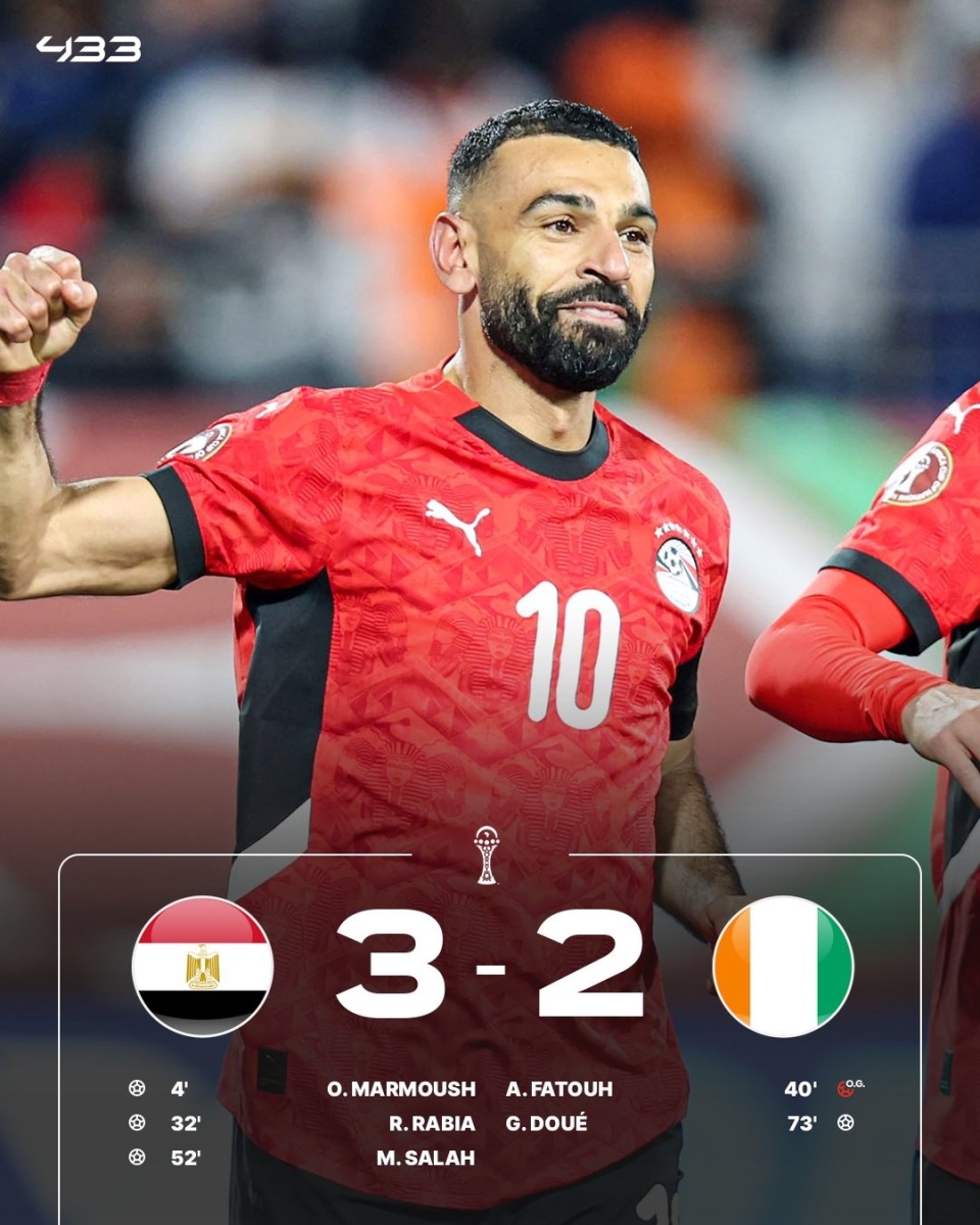 非洲杯8强战,埃及3-2击败卫冕冠军科特迪瓦,晋级四强,将战塞内加尔。上半场马尔穆什单刀闪击首开记录,萨拉赫助攻拉比亚头球扩大比分,法图门前自摆乌龙,阿舒尔助攻萨拉赫推射破门,杜埃补射建功。【详情】
