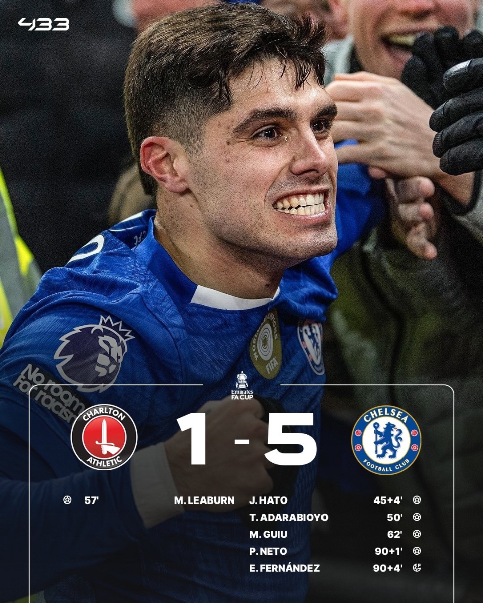 切尔西客场5-1大胜查尔顿,晋级足总杯32强。哈托爆射建功,阿达拉比奥尤头槌破门,里本扳回一城,吉乌补射建功,内托再下一城,恩佐点射锦上添花。【详情】