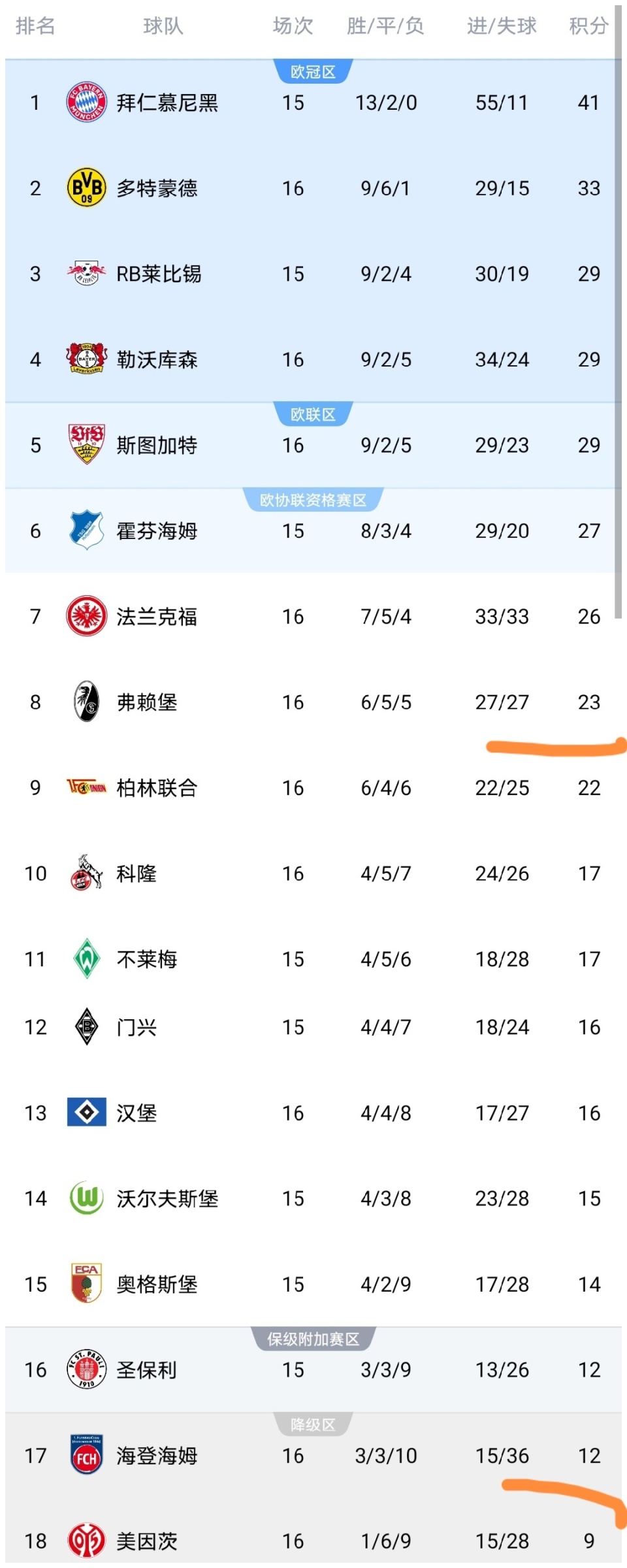 昨晚至今天凌晨,德甲第16轮结束4场较量,德甲积分榜因此更新,我们来看看。