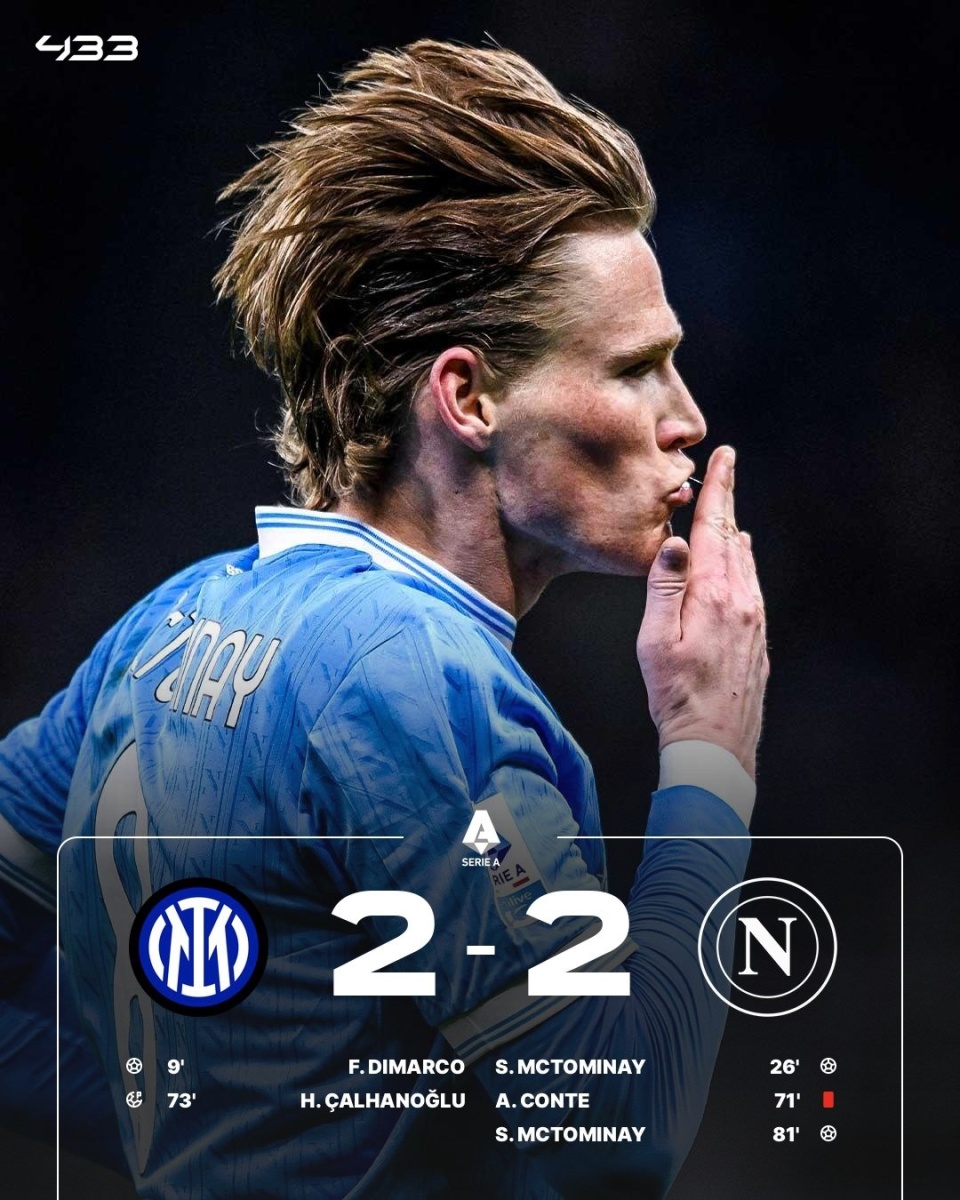 意甲第20轮,国米2-2战平那不勒斯,意甲6连胜终结,暂时3分领跑,那不勒斯排名第3。迪马尔科小角度破门,麦克托米奈扳平比分,下半场,姆希塔良禁区内被踩到,VAR判罚点球,孔蒂不满判罚吃到红牌,恰尔汗奥卢点射命中,麦克托米奈梅开二度再度扳平。