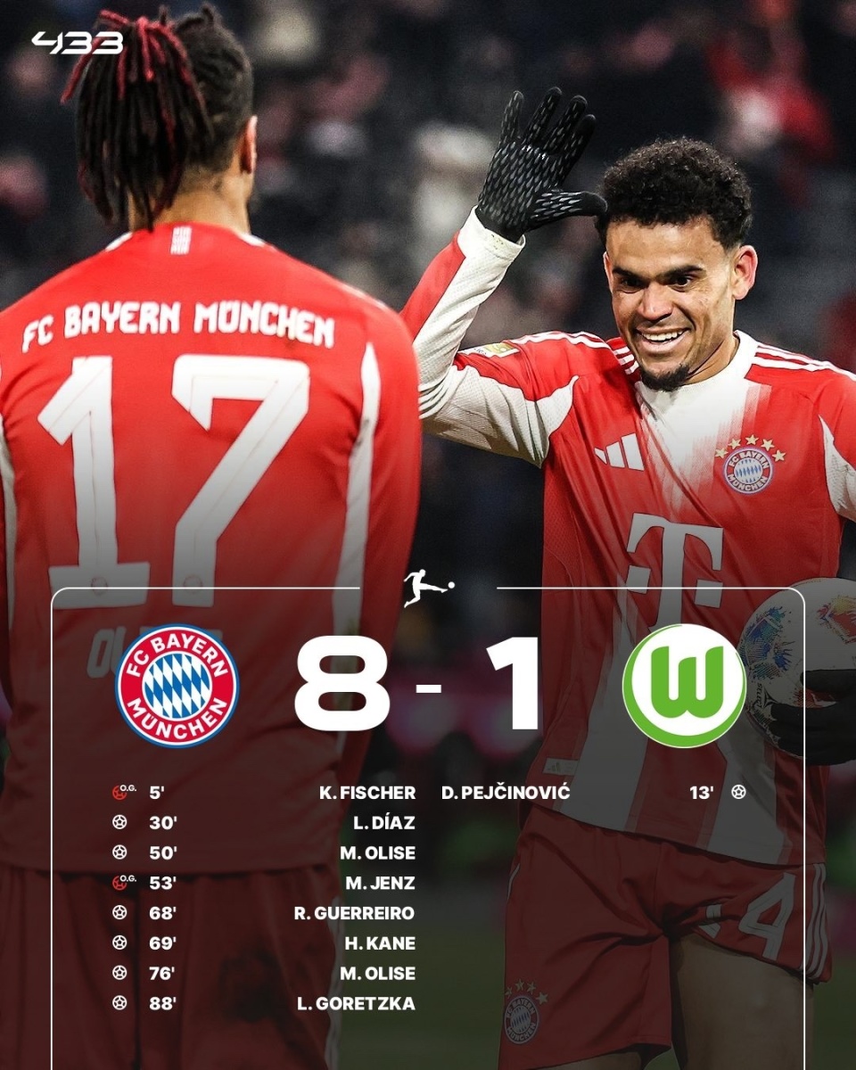 德甲第16轮,拜仁8-1沃尔夫斯堡,11分领跑。迪亚斯造成费舍尔乌龙,佩伊契诺维奇扳平比分,迪亚斯头球破门。奥利塞轰进世界波+造成延斯乌龙,格雷罗、凯恩和格雷茨卡各进一球。