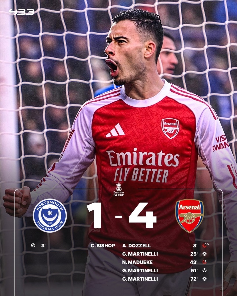 阿森纳客场4-1朴茨茅斯,晋级足总杯32强。埃泽失误被断球,毕肖普破门,多泽尔自摆乌龙,马丁内利头球破门反超,马杜埃凯造点自己主罚打偏,下半场马丁内利双响。
