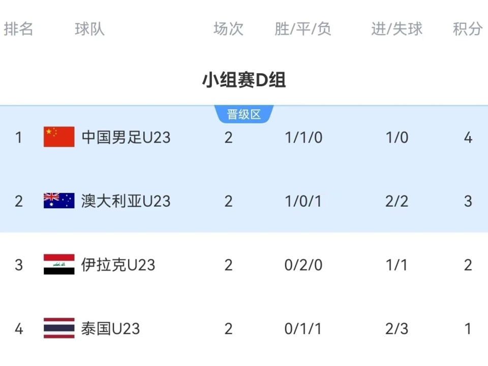 U23国足所在的D组,两轮过后的排名情况是U23国足积4分排名小组第一,进球1个,净胜球1个;澳大利亚U23积3分排名小组第二,进球2个,净胜球0个;伊拉克U23积2分排名小组第三,进球1个,净胜球0个;泰国U23积1分排名小组垫底,进球2个,净胜球负1个。末轮对战形势是U23国足VS泰国U23,以及澳大利亚U23对战伊拉克U23 ,两场比赛将于1月14日晚间19:30分同时开球。