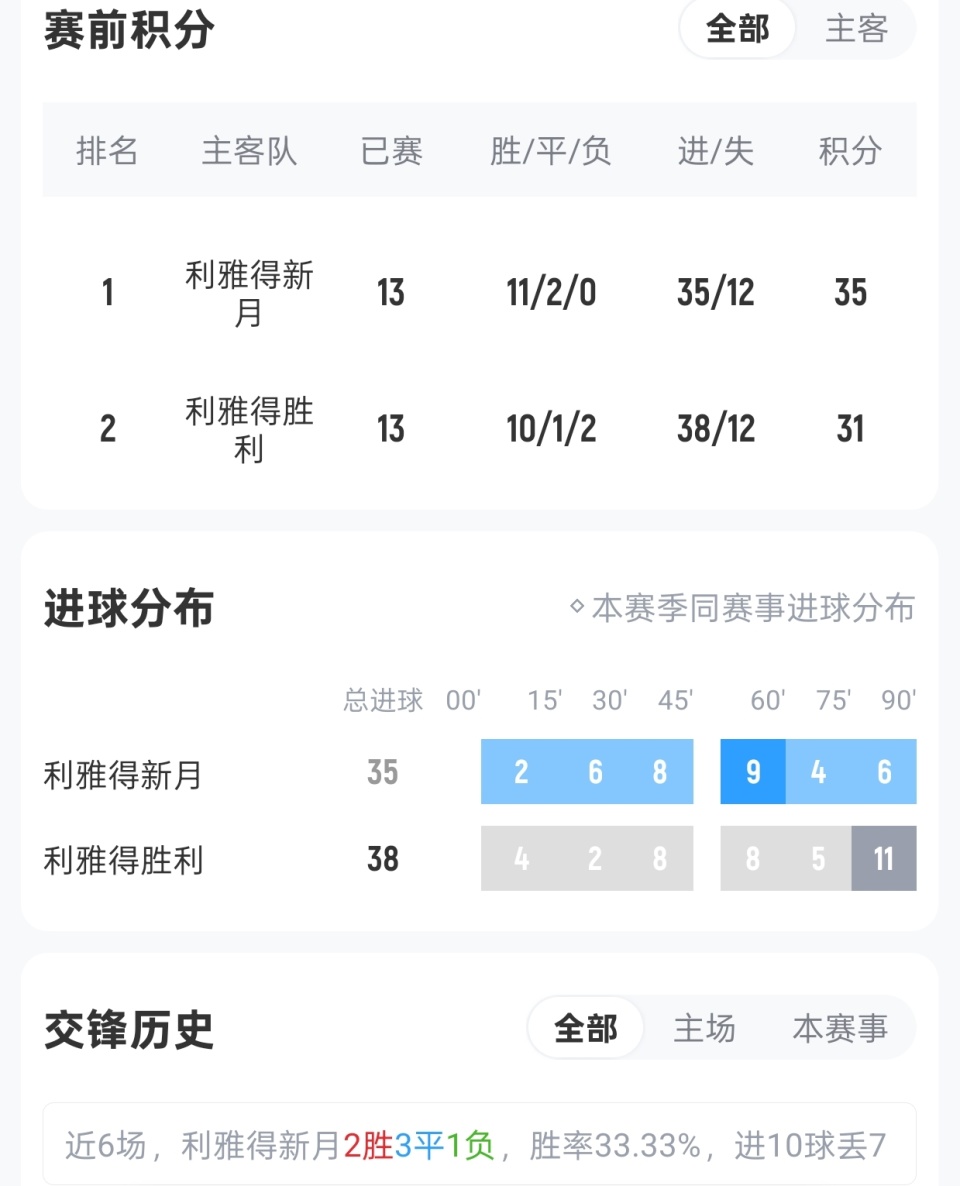 双方近6次交手,利雅得新月2胜3平1负,略占上风。