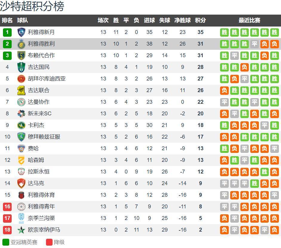 第一:两队情况!沙特超13轮战罢,利雅得新月11胜2平保持不败,积35分排名第一;利雅得胜利10胜1平2负积31分排名第二,两队相差4分。上轮联赛,利雅得新月主场3-0大胜哈森姆,各项赛事豪取18连胜;利雅得胜利主场1-2不敌胡拜尔库迪西亚,近3轮联赛不胜,1平2负3轮丢了8分,从领先利雅得新月4分到落后对手4分,沙特超争冠格局立马大变天。利雅得新月总身价1.95亿欧元,队内有努涅斯、马尔科姆、米林科维奇、鲁本-内维斯、特奥、库利巴利、布努等前五大联赛球星;利雅得胜利总身价1.38亿欧元,队内有马内、C罗、科曼、菲利克斯、B罗、伊尼戈、西马坎等前五大联赛球星。