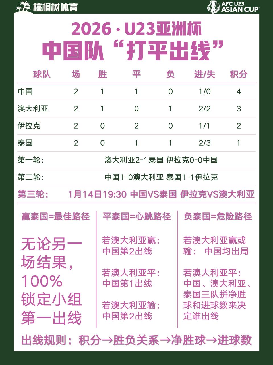 澳大利亚平伊拉克:中、澳、泰三队同积4分,将进入净胜球与进球数的精细计算,出线形势极为被动。