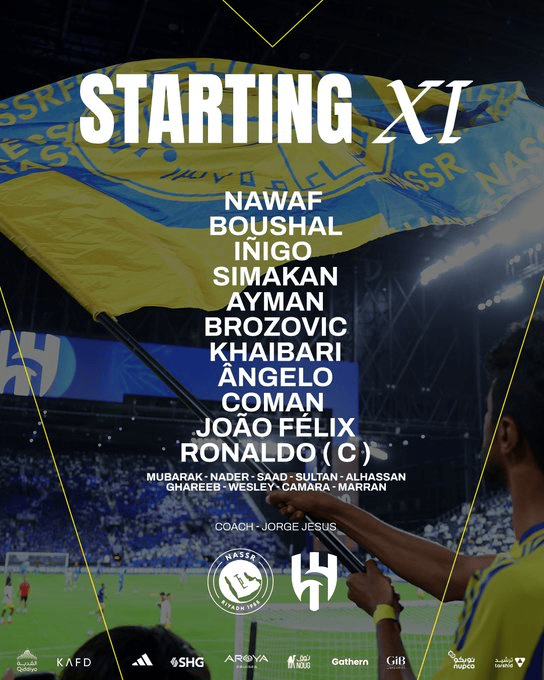 胜利首发:1-阿尔阿奇迪、12-布沙尔、26-伊尼戈、3-西马坎、23-叶海亚、11-布罗佐维奇、20-安杰洛、17-阿尔卡巴里、21-科曼、79-菲利克斯、7-C罗