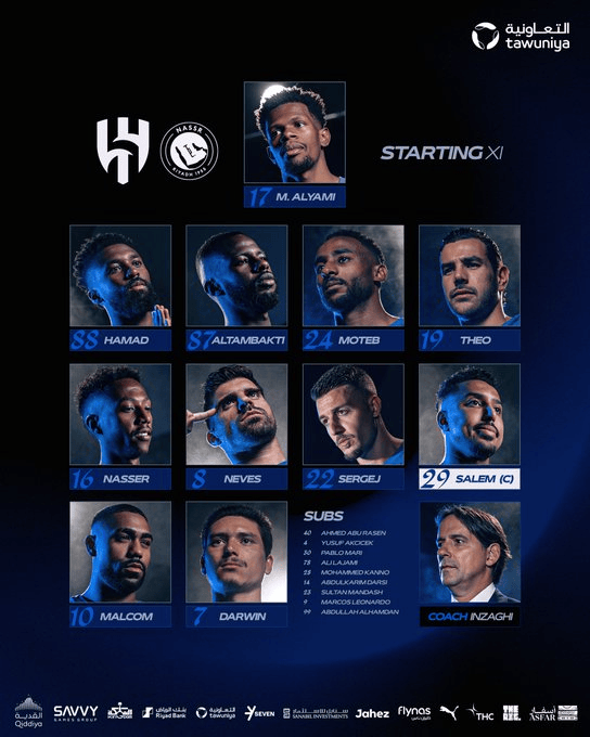新月首发:17-鲁巴耶、88-阿尔亚米、87-阿尔坦巴克蒂、24-哈尔比、19-特奥、16-N-阿尔多萨里、8-内维斯、22-米林科维奇、29-阿尔多萨里、10-马尔科姆、7-努涅斯