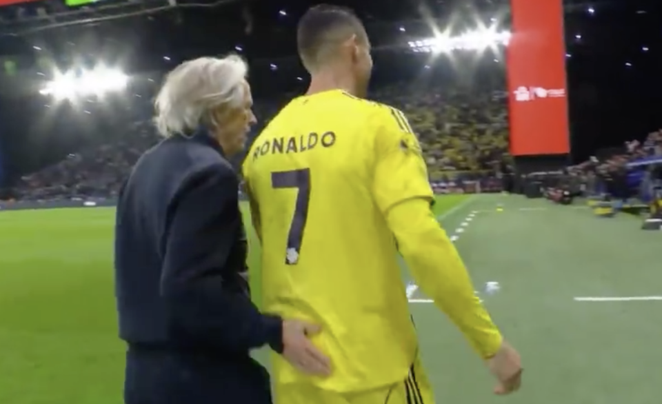 随即,利雅得胜利主帅热苏斯做出了换人的决定,让40岁的C罗下场休息。而在葡萄牙巨星离场的时候,利雅得新月主场超2万名球迷一起高喊梅西的名字,以此来挑衅和羞辱C罗。对此,C罗只能苦笑,并不断摇头。