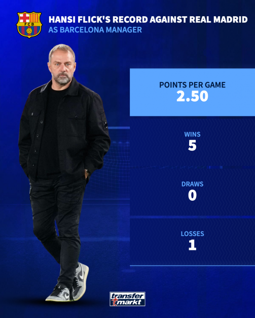截至目前,弗里克执教巴萨对阵皇马6次,赢了5场,只输过1次。