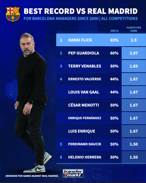 自2000年以来,没有任何一位巴萨主帅,在国家德比中对皇马的胜率能达到弗里克的高度——83%。