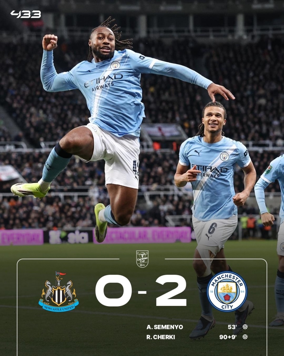 英格兰联赛杯半决赛首回合,曼城客场2-0击败纽卡,占据先机。吉马良斯中柱,特拉福德作出关键扑救,塞梅尼奥首开纪录,随后再打进一球,但是队友越位在先,谢尔基补射破门。详情>>