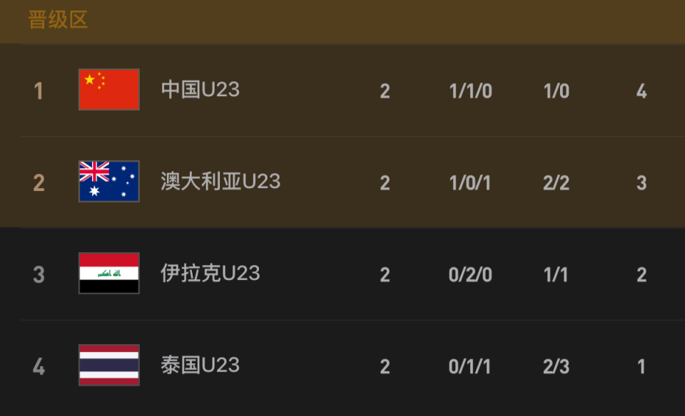 2轮战罢,U23国足4分领跑,澳大利亚队3分第2,伊拉克队2分第3,泰国队1分第4。最后一轮,U23国足将对阵泰国队,澳大利亚队对阵伊拉克队。