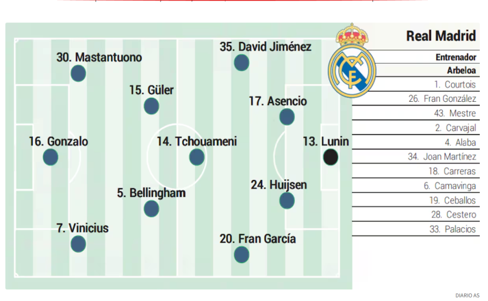 阿韦洛亚时代皇马首秀的先发阵容是这样的:卢宁/希门尼斯、阿森西奥、赫伊森、加西亚/居莱尔、琼阿梅尼、贝林厄姆/马斯坦托诺、冈萨洛、维尼修斯。虽然皇马有姆巴佩、吕迪格缺席,罗德里戈受伤也出战成疑,但面对阿尔巴塞特这样的孱弱对手,皇马这套阵容已经足够强大。