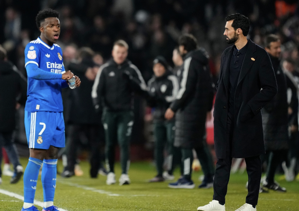 最终,皇马爆冷无缘国王杯8强,场边的阿韦罗亚非常沮丧,表情严肃。此役,身价1.5亿欧的维尼修斯发挥糟糕,3次射门,1次射正,大量皇马球迷要求高层将其出售。
