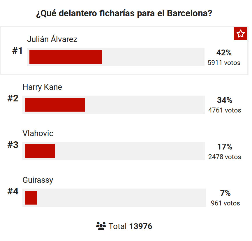 那么谁来接替波兰神锋呢?《马卡报》做了一个民意调查,在凯恩、阿尔瓦雷斯、吉拉西和弗拉霍维奇4名前锋中,阿尔瓦雷斯得到了42%的支持度,这名阿根廷国脚不仅深受弗里克和德科的赏识,而且也是巴萨球迷的最爱,不过要想签下阿尔瓦雷斯也不容易,至少需要准备1亿欧元。另一个选项是凯恩,根据多方消息他的解约金是6500万欧元,而且年薪也高达税前2500万,拜仁并不想放走这名高产射手。综合来看,还是阿尔瓦雷斯更对巴萨胃口。