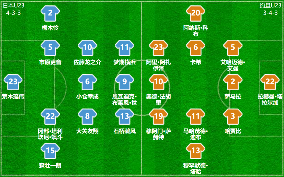 日本U23队:23-荒木琉;2-梅木怜、5-市原吏音、15-森壮一朗、22-冈部飒斗;6-小仓幸成、8-大关友翔、10-佐藤龙之介;9-恩瓦迪克·乌彻·布莱恩·世雄、11-横山梦树、13-石桥濑凪