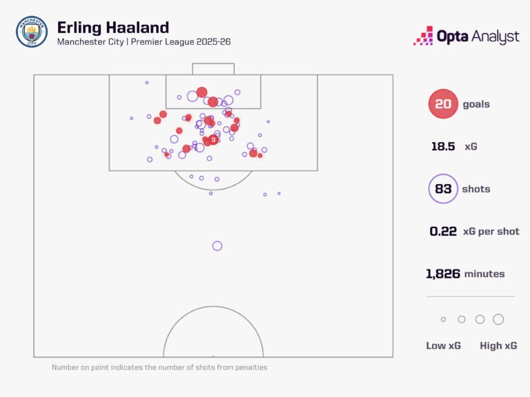 哈兰德近期状态并不算火热。过去 6 场各项赛事,他只打入 1 球,那还是对阵布莱顿的点球。这段时间,他仅有这一粒进球参与。